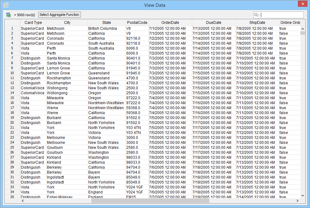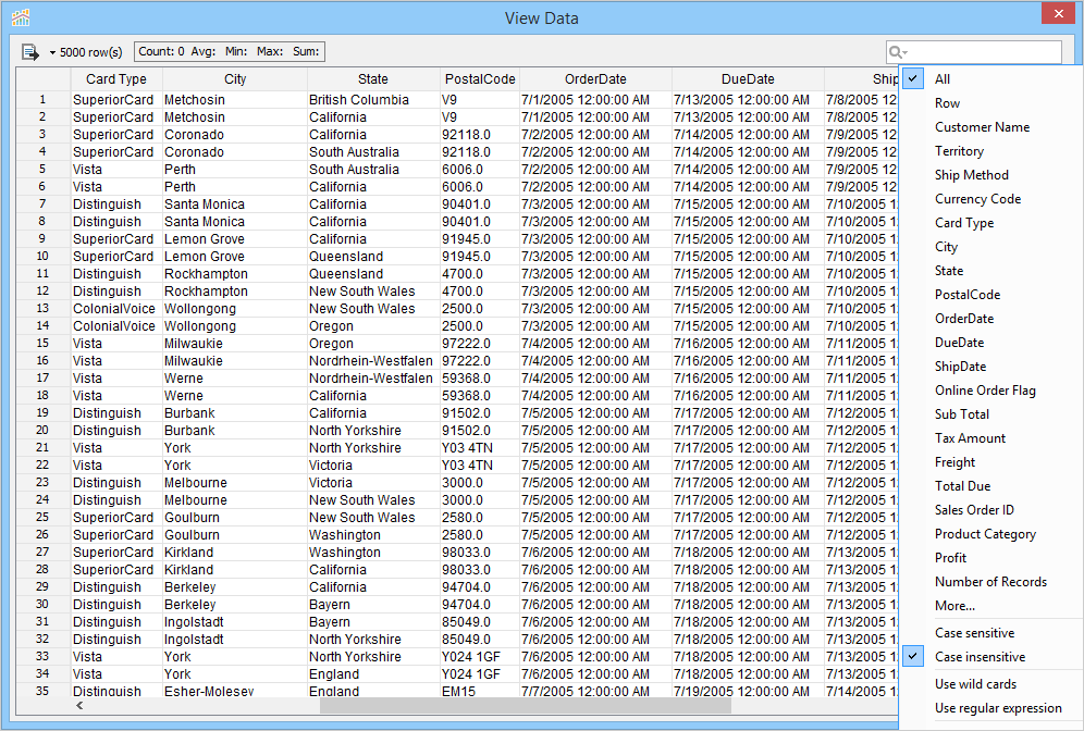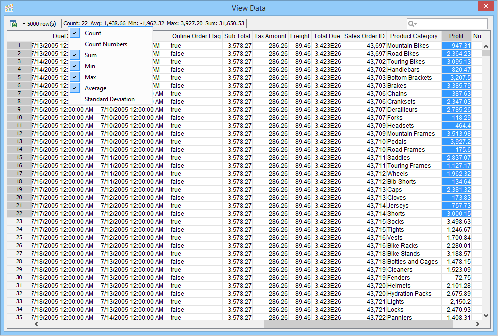 The View Data window supports quick filtering, aggregate functions, and multicolumn sorting. Aggregate Functions allows calculation of Count, Count Numbers, Sum, Min, Max, Average, and Standard Deviation functions on the rows that you select in the View Data window.