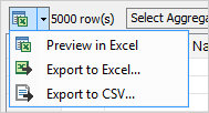 Another option that is available in the View Data window is Preview in Excel () that exports the data to an Excel spreadsheet. Additional options appear on clicking the arrow that is available next to the icon.