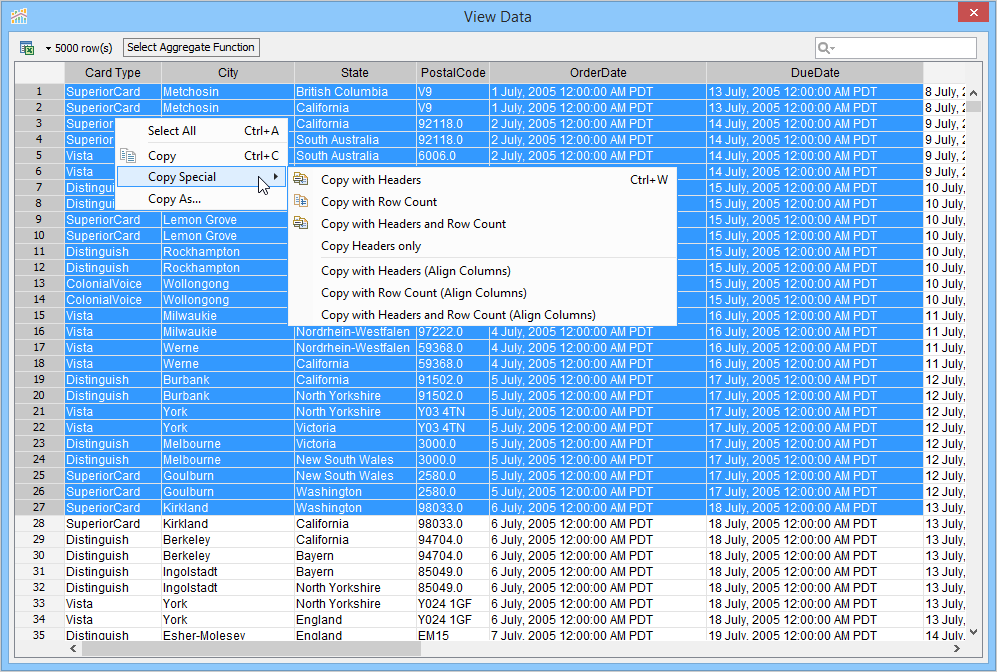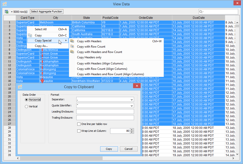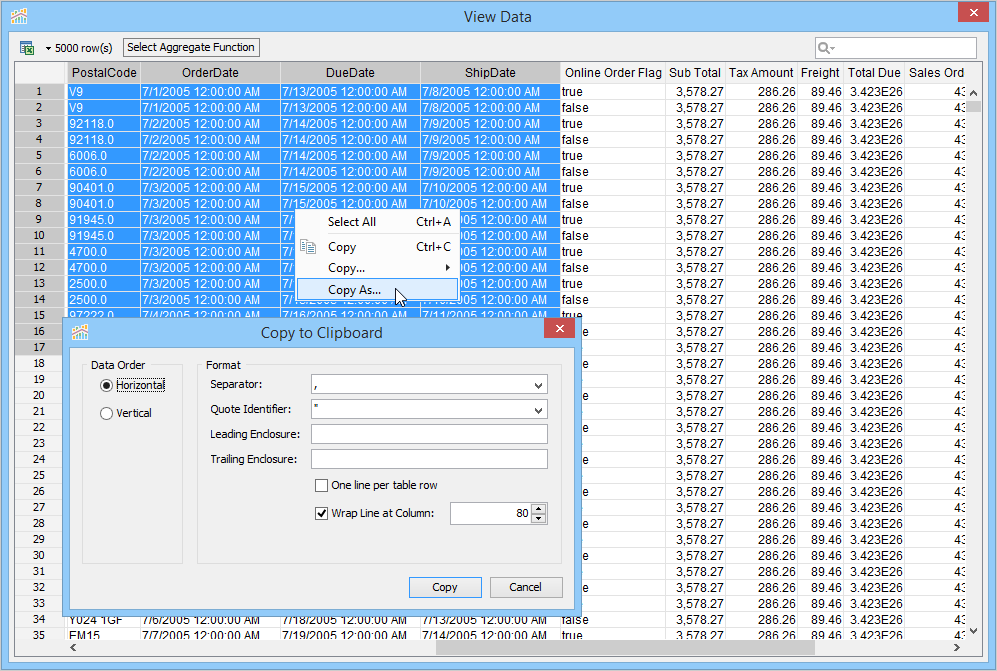 | Copy with Headers and Row Count | Copies column headers and row counts, along with data. |