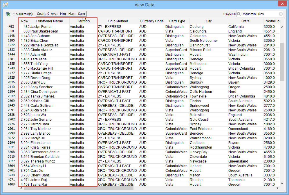 Multi-Column sorting with ascending or descending is supported. For example, to sort Territory in descending order and Customer Name in ascending order, click the Territory header and then press Ctrl, and then double-click Customer Name header. The icons appearing on the headers are a sign of successful sorting.