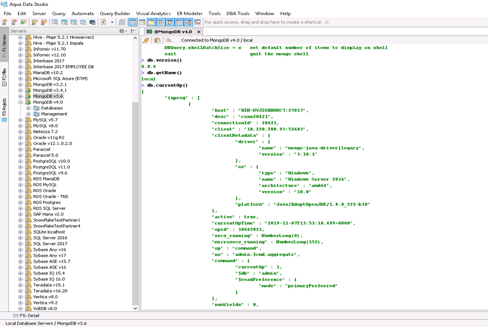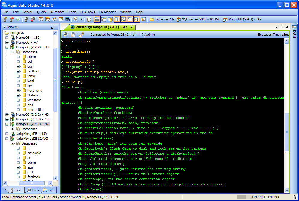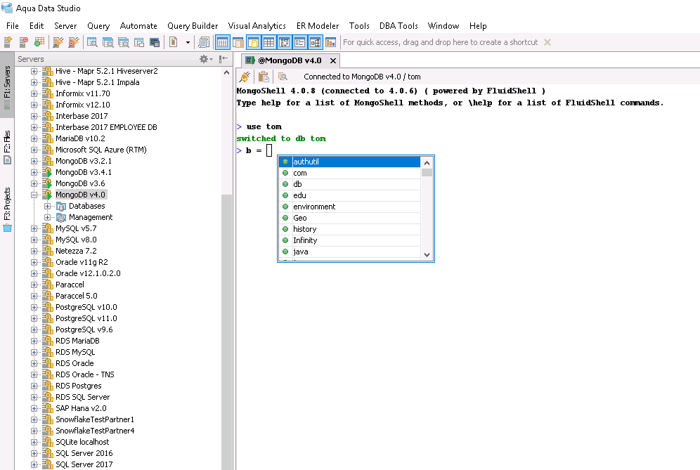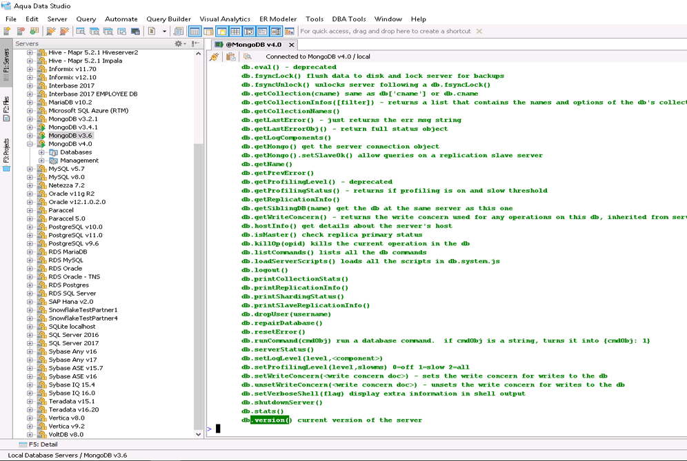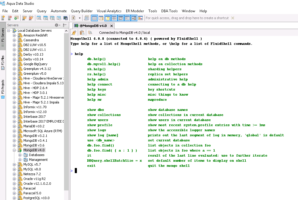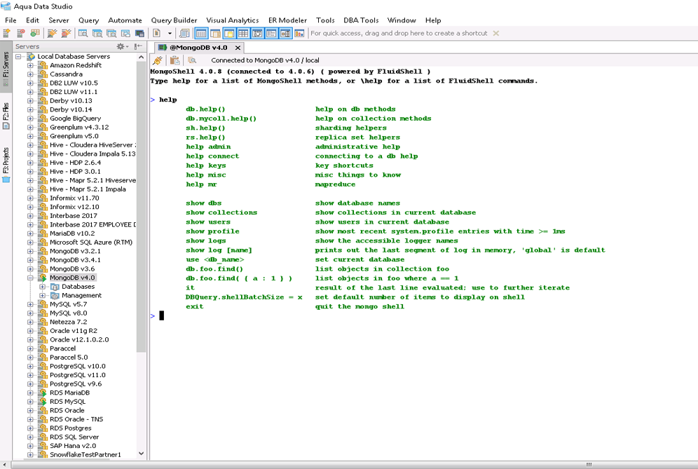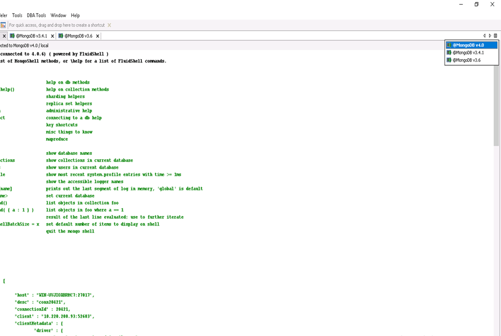 MongoShell provides you a near complete replacement for the command line shell shipped with MongoDB. You get complete control of your MongoDB deployment within a FluidShell-like interface along side all of our MongoDB visual editing tools and Query Analyzer.