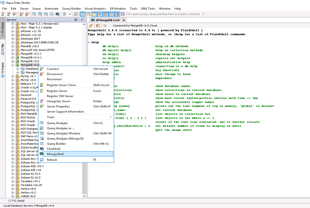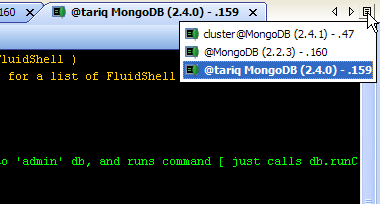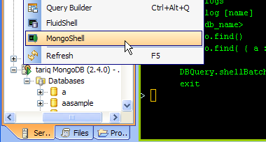 Once you register a MongoDB server, right click on it to see MongoShell in the drop down menu. It appears just below FluidShell. Just like FluidShell, when MongoShell launches, it appears as a tab in the Main Application Workspace.