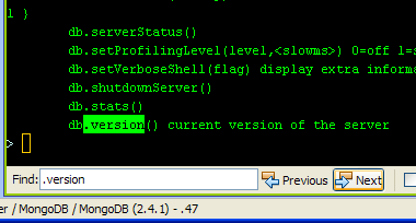 The toolbar at the top of every MongoShell has buttons for pasting from the clipboard and finding in the buffer. Simply drag across content to copy it to the clipboard. The Find button makes it easy to track down the needle in a haystack of JSON content with Find Previous and Find Next. Reconnect is useful if a connection is lost due to network timeouts or congestion.