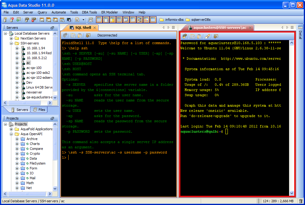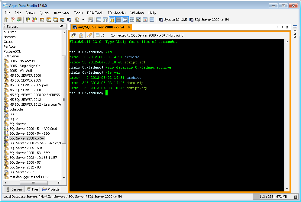 Aqua Data Studio now includes an integrated shell named FluidShell. FluidShell is an interactive database shell for all major database vendors which provides the combined functionality of a Unix Shell 1 with a SQL command line 2 tool. This combination of functionality grants users the power to automate the extraction, transformation and loading of data from within a single shell. FluidShell includes commands that match common Unix commands and functionality similar to most Unix shells such as variable substitution, alias commands, command substitution, input/output redirection, pipelines and command history. FluidShell can execute SQL scripts, shell scripts and AquaScripts to provide a diverse and flexible method to automate your daily tasks. Automate more and do more in less time.