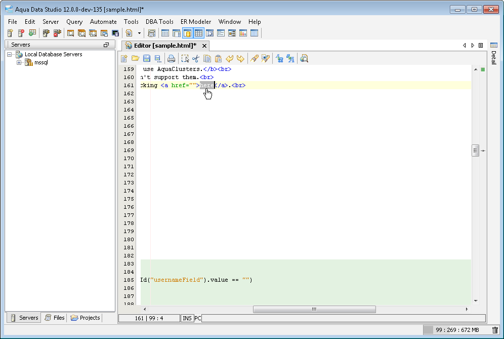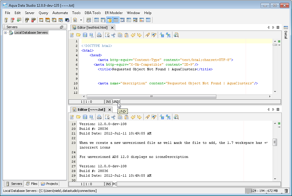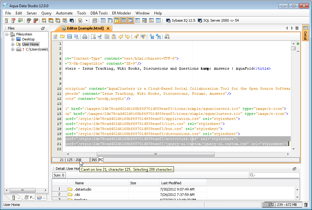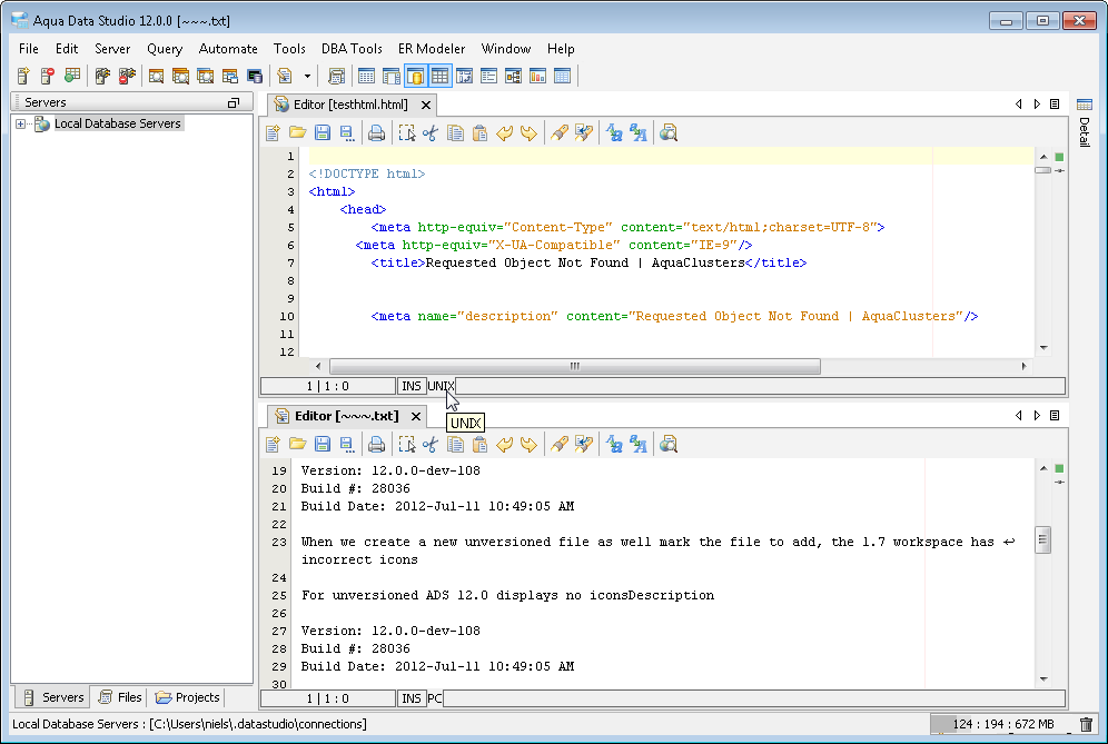 The Aqua Data Studio Editor continues to evolve and acquire enhancements found in the most modern editors. This new version includes line wrapping and line/block selection for better text manipulation. It also includes an enhanced status bar so users can better identify the cursor position, text selection sizes and the platform type of the files being edited.