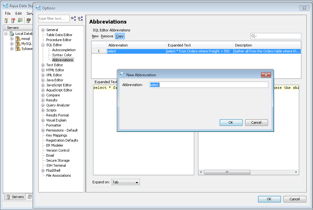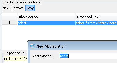 To quickly reuse and alter existing Editor Abbreviations, it is now possible to select one and click the newly added Copy button to use its contents with a new Abbreviation.