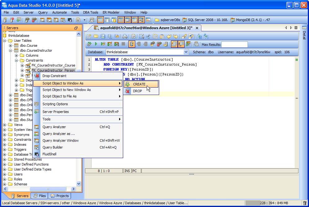 Right click on a SQL Database (Azure) object in the Schema Browser and you can script it as CREATE, ALTER, DROP to have Aqua Data Studio generate DDL for you. With the Schema Script Generator you can pick and choose which objects to script, or script the entire contents of a server.