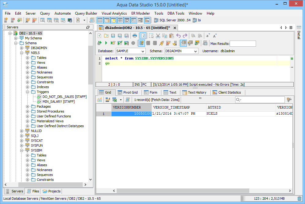 Version 10.5 of DB2 is ready for use with all of the DB2 features already built into Aqua Data Studio, including the DBA Tools. We now also support scripting ORGANIZE BY COLUMN AND ROW, as well as CREATE INDEX with column direction RANDOM.