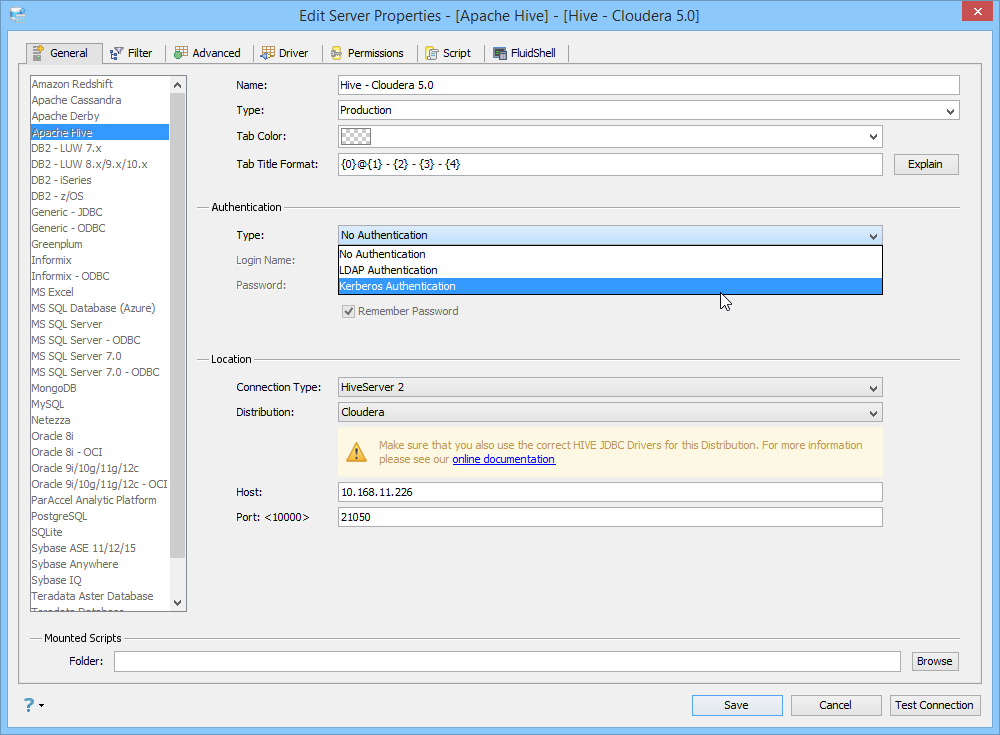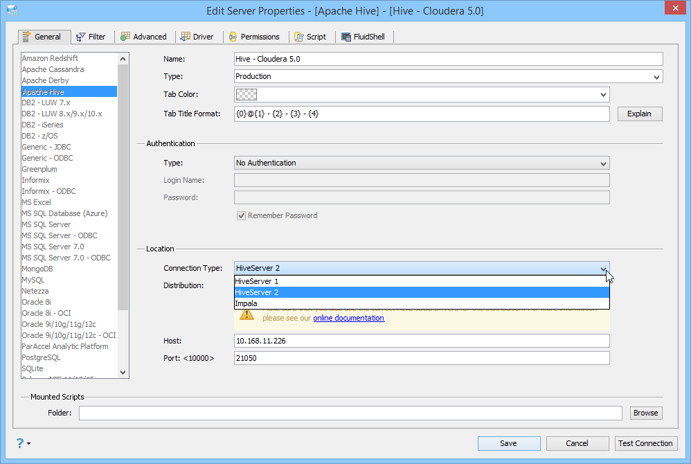 We now allow you to use your MapR, Cloudera and Hortonworks jdbc drivers to access more Hive distribution specific features. Choose your distribution in the Server Properties dialog when registering a new Hive server.