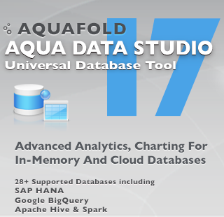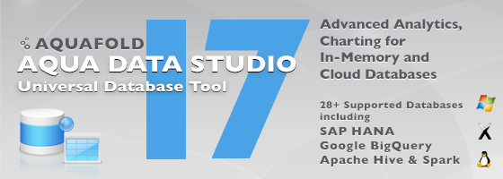 Aqua Data Studio's version 17.0 release adds native support for three very popular Big Data and cloud-based data products: SAP Hana, Google BigQuery, and Apache Spark. Business analysts will value the productivity enhancements offered by our enhanced Excel SQL capabilities, our new Excel import wizard and our new MongoDB UI for JavaScript. Database administrators will appreciate the expanded DBA tools coverage to manage more databases along with our expanded Explain Plan support to identify SQL query bottlenecks quickly.