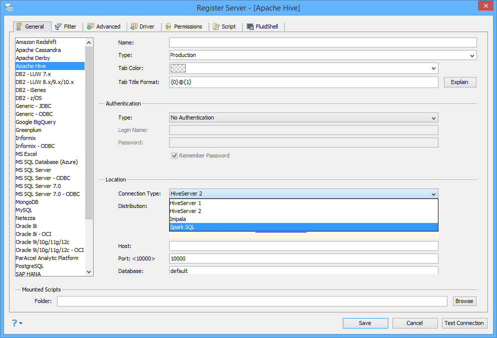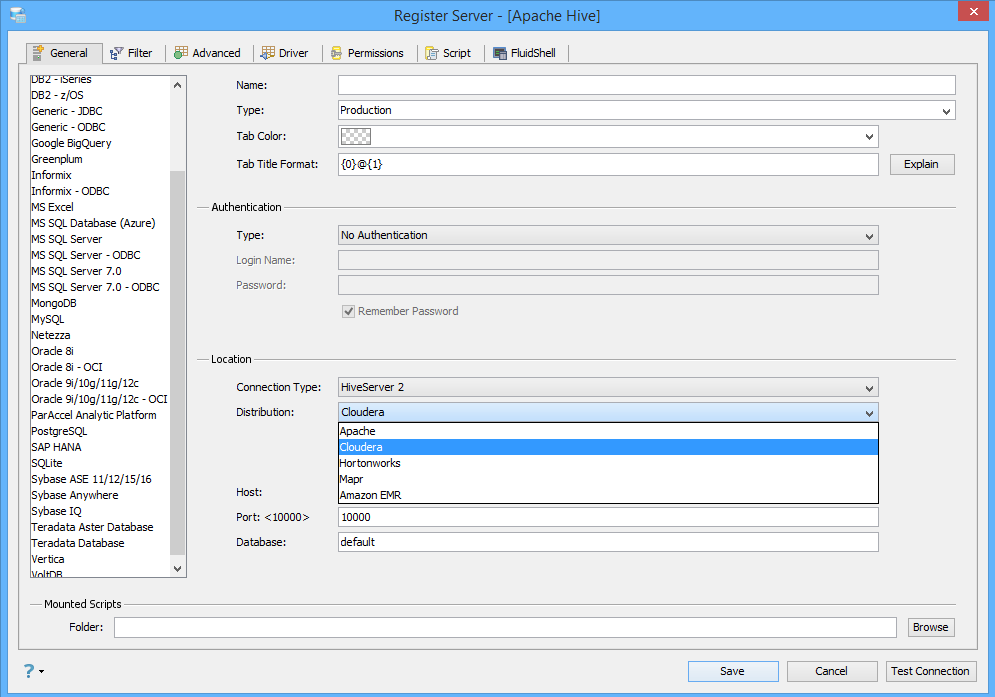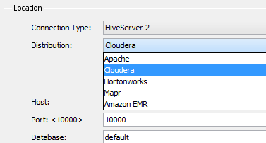 We now have updated support for MapR, Cloudera and Hortonworks jdbc to access more Hive distribution specific features. Choose your distribution in the Server Properties when registering a new Hive server.