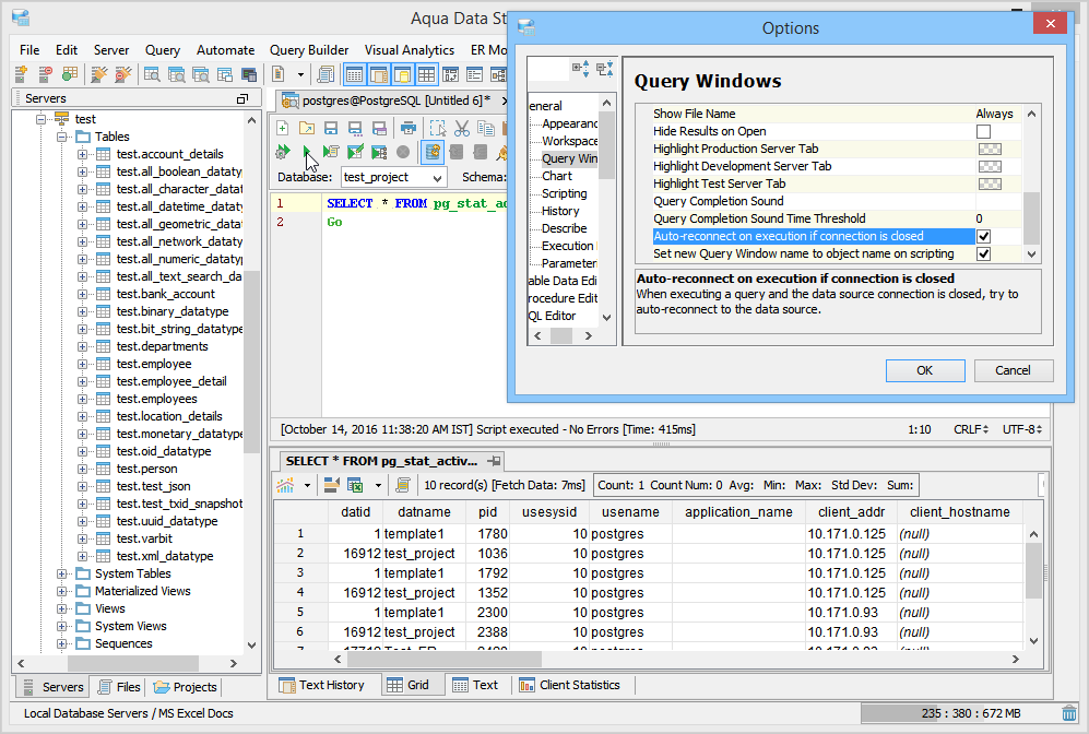 Auto-reconnect checks if your connection to Query Analyzer is still valid. If your connection is closed or severed, then auto-reconnect establishes a connection and sends the query to the server. Use File > Options > General > Query Windows to enable this option.
