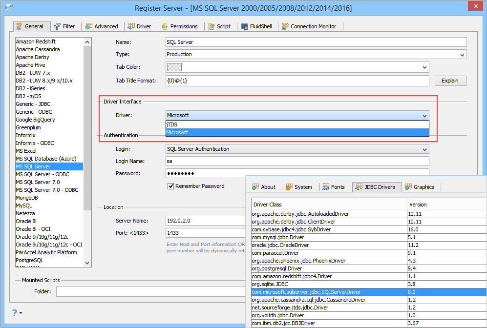 A Driver interface drop-down has been added to the Register Server dialog which lets you choose either the jTDS or Microsoft JDBC driver to interact with MS SQL Server and Azure.