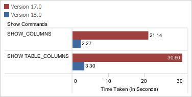 The time taken to expand the schema objects in Excel database has improved. On expanding a table tree node in a schema containing 100,000 records, Aqua Data Studio version 18.0 takes 3.30 seconds to retrieve data as compared to Aqua Data Studio version 17.0 which took 30.60 seconds.