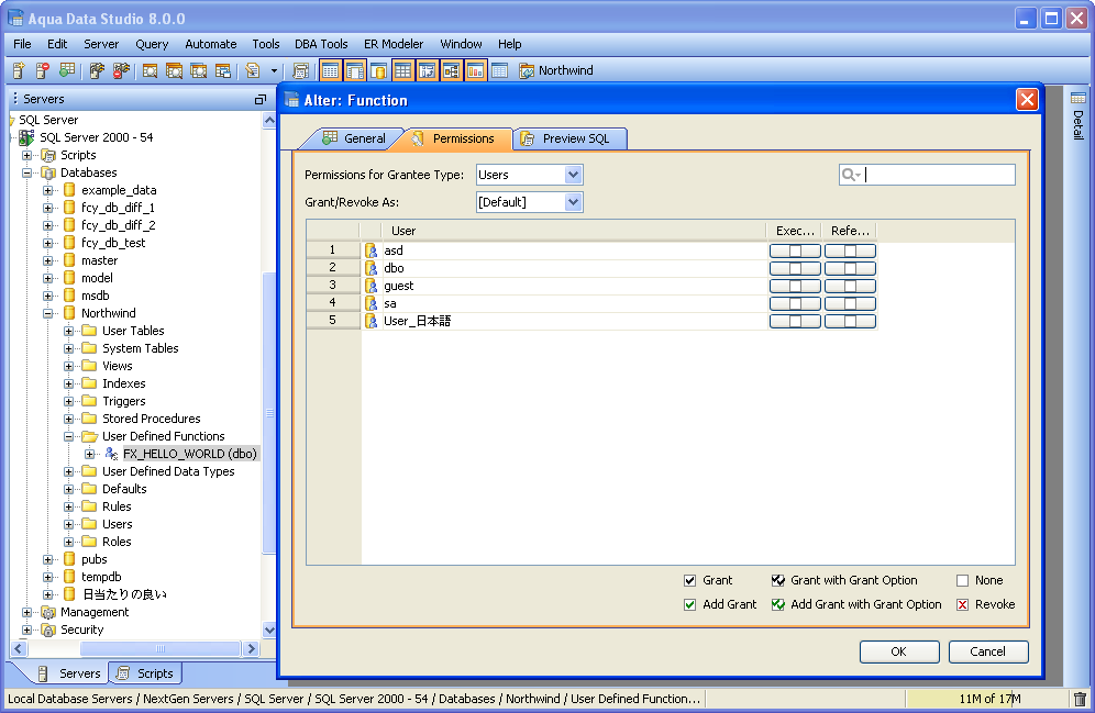 Visual Editing of schema objects now support permissions viewing and altering for users and roles. Below is a list of object permissions support by database and object type.