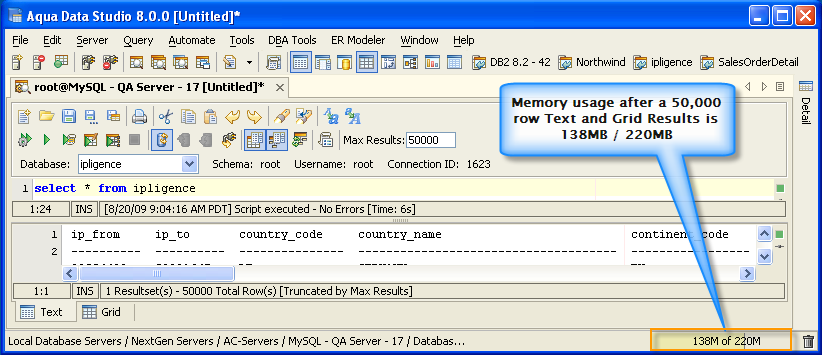 Version 8.0 of Aqua Data Studio now includes improved memory optimization methods than previous versions. One of these techniques is a memory compression method for optimizing resultsets which includes redundant data such as numeric data. Querying for large results in data warehousing environments with large quantities of numeric data will yield dramatic memory reductions. Long term use of Aqua Data Studio in these environments will keep memory usage low and in turn keep performance of the application high. The optimizations are most apparent in the Query Analyzer, Query Builder, Saving Results and Exporting of data.