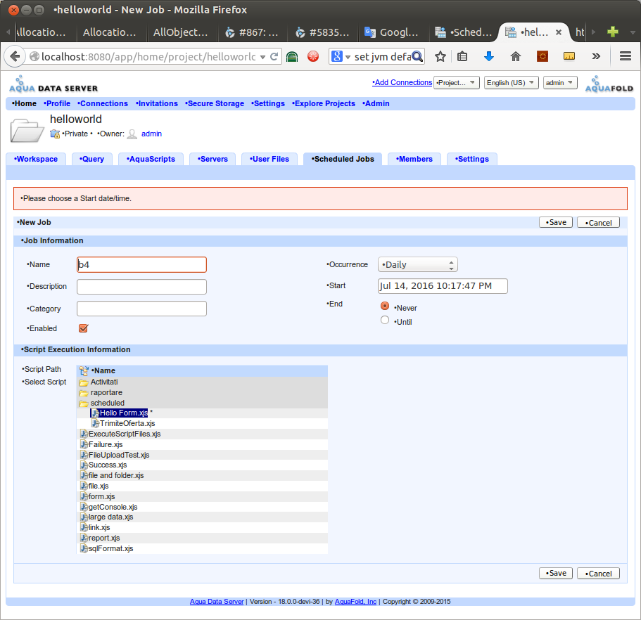 Step 2) Enter a name, "test" and select any AquaScript