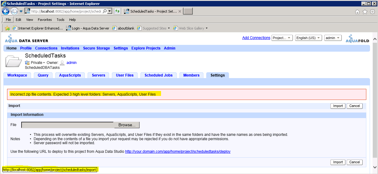 I have been able to sync my project from Studio to AQ Server, but the Workspace doesn't include the project contents. When I attempt to manually import I see the attached errors