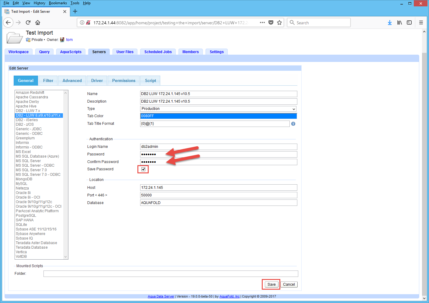 NOTE: DB Server passwords are stored in an encrypted format in Aqua Data Studio's .conn file. When you import a DB connection, the DB Server password is not saved. Instead, you need to edit the imported server and specify the password again.