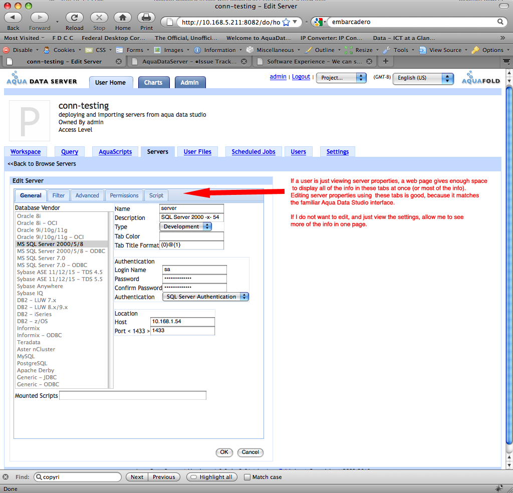 Editing server properties using the current tabs is good, because it matches the familiar Aqua Data Studio interface.