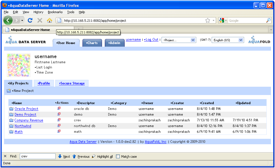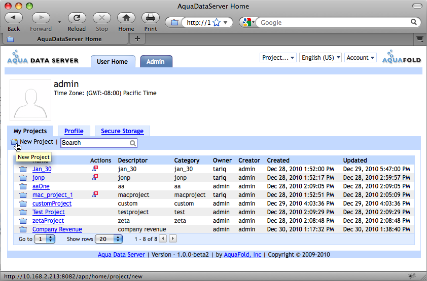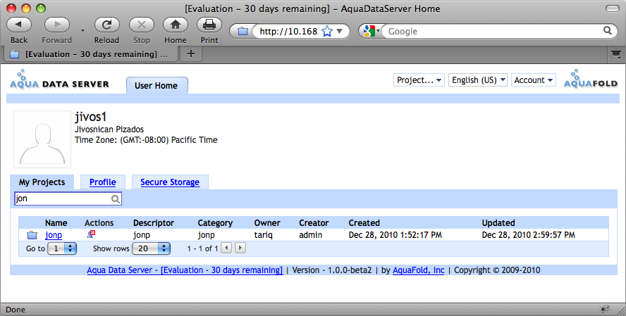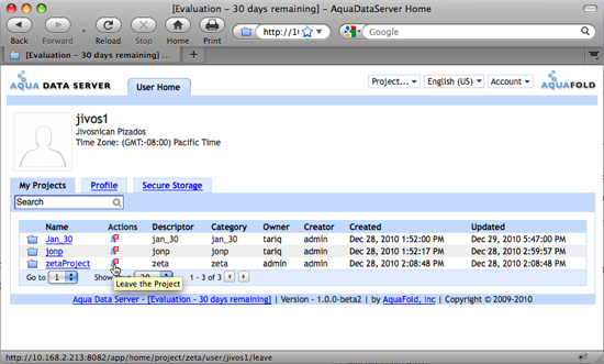 Most of the user created content in Aqua Data Server exists in the context of a project. As a user, your access is restricted to projects that you own or are a member of. The My Projects tab displays all of these projects. On this page: