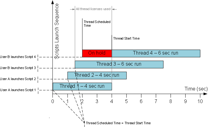 In this example the launch (or scheduled) time for the Script 4 was different from the actual Start time. The script was put on hold by the server for the period of 2 seconds as it awaited the release of an execution thread. For simplicity this example does not include short time thread allocations by GUI actions of users. In reality, if all actions are taken into the account, the diagram would look more complex, however the principle remains the same – if all thread licenses are used, the server will put all consecutive actions on hold (in the order they are scheduled or launched from the GUI) and will start them once an execution thread becomes available.