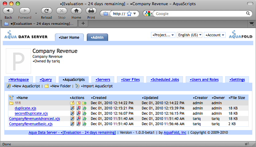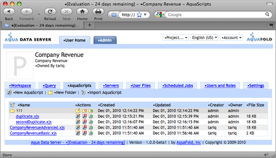 AquaScripts, similar to the way you would manage files in your OS. You can also view the contents of an AquaScript by clicking on its name. This will launch the AquaScript editor and give you the option of executing the script. If certain actions are not available, then you do not have the necessary project permissions.