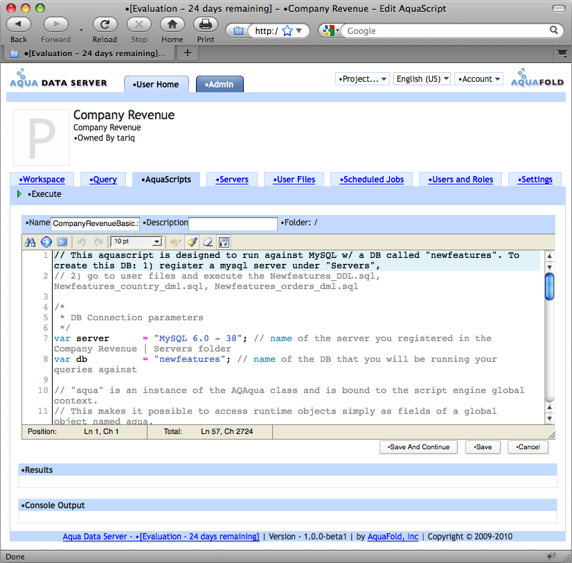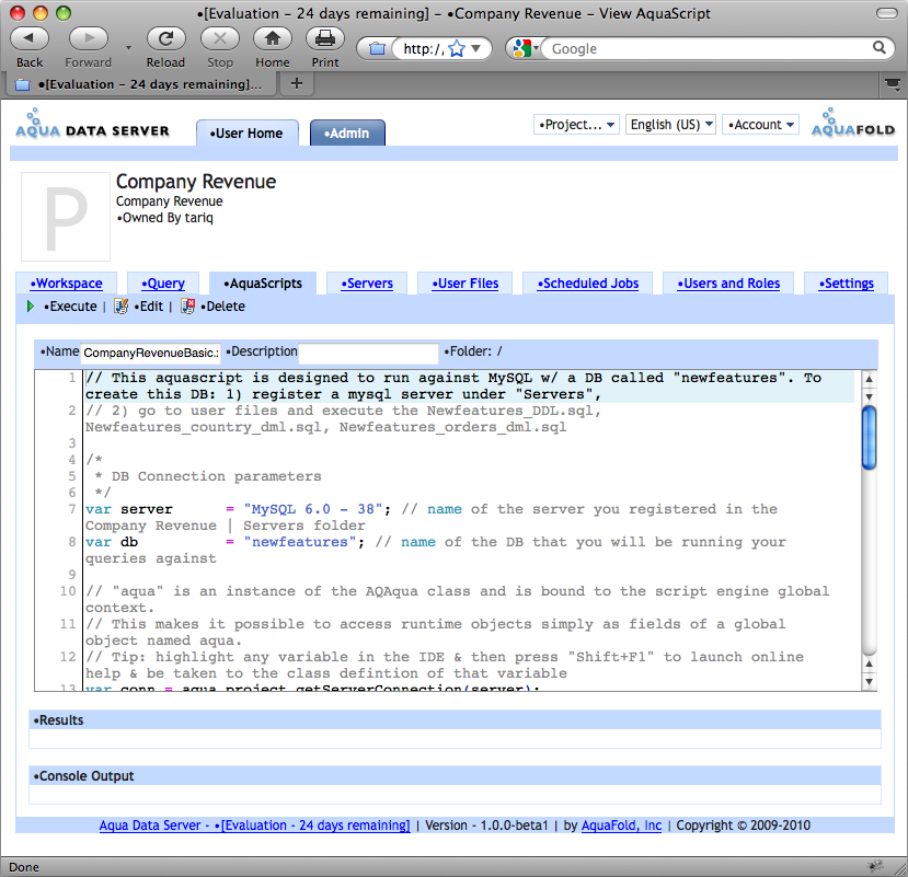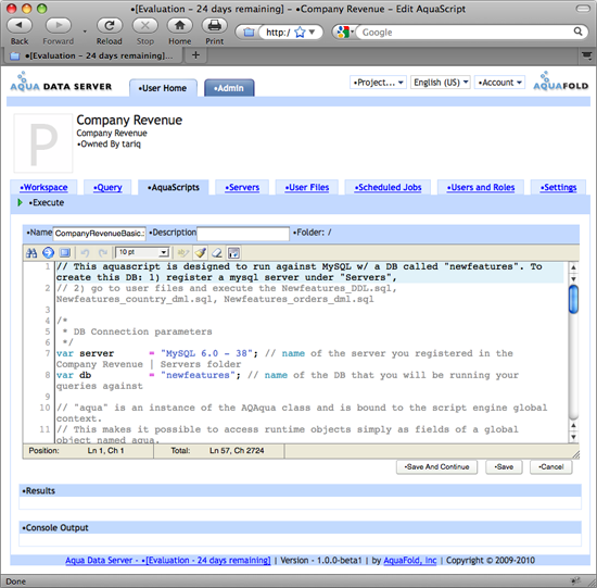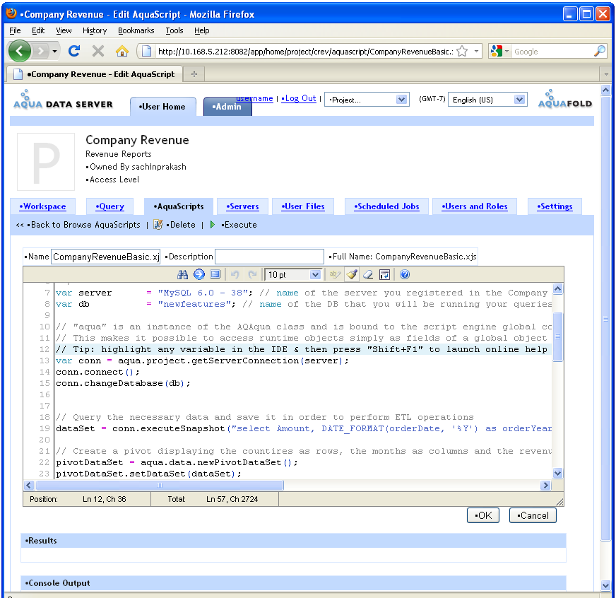 AquaScript Editor provides three panes: “AquaScript” editor for entering and editing AquaScript code, the "Results" pane which shows output created from the aqua.response.write API (this is also what is shown in the project's workspace) and the “Console Output” pane which shows messages that are sent to the console - typically output of aqua.console API methods. Console output messages are not displayed in the project's workspace. Console output is a useful tool for script debugging without showing the debugging messages in the user accessible Workspace. Also, if you create a Scheduled Job, each time the job executes the console messages printed from the AquaScript are saved as part of the job's execution history record.