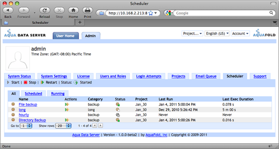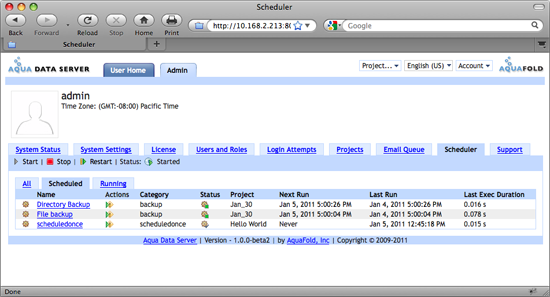 The Scheduler tab enables administrators to view and manage all scheduled jobs in the system. The "View Scheduler" system permission is required. For an overview of Scheduled Jobs and how to use them, see Basic Concepts: Scheduled Jobs. On tihs page: