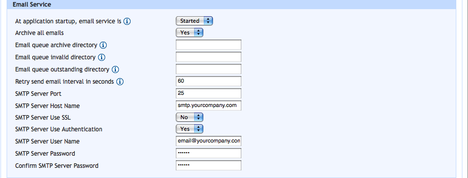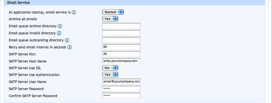 This section is for configuring the Aqua Data Server email queue service and SMTP server connection information used for sending out emails. SMTP Server information must be specified in order to send out emails to new users and use the reset password functionality.