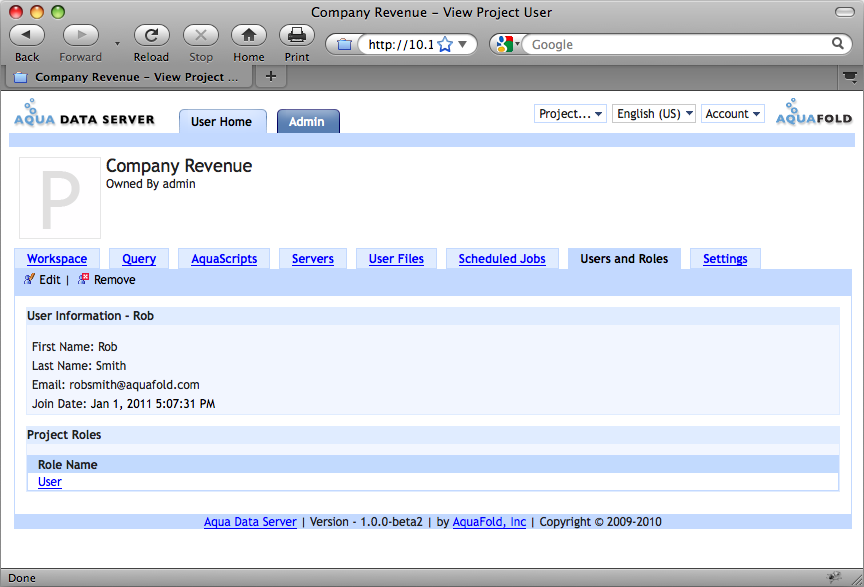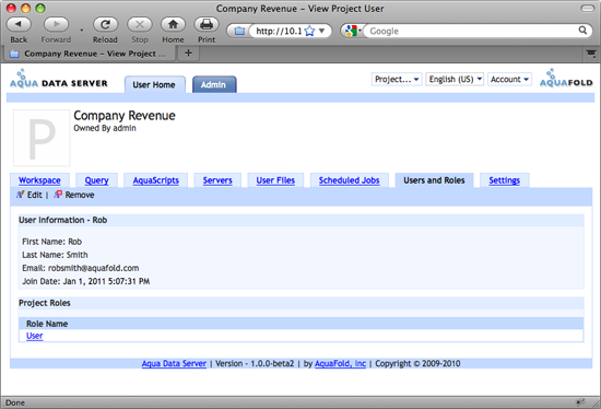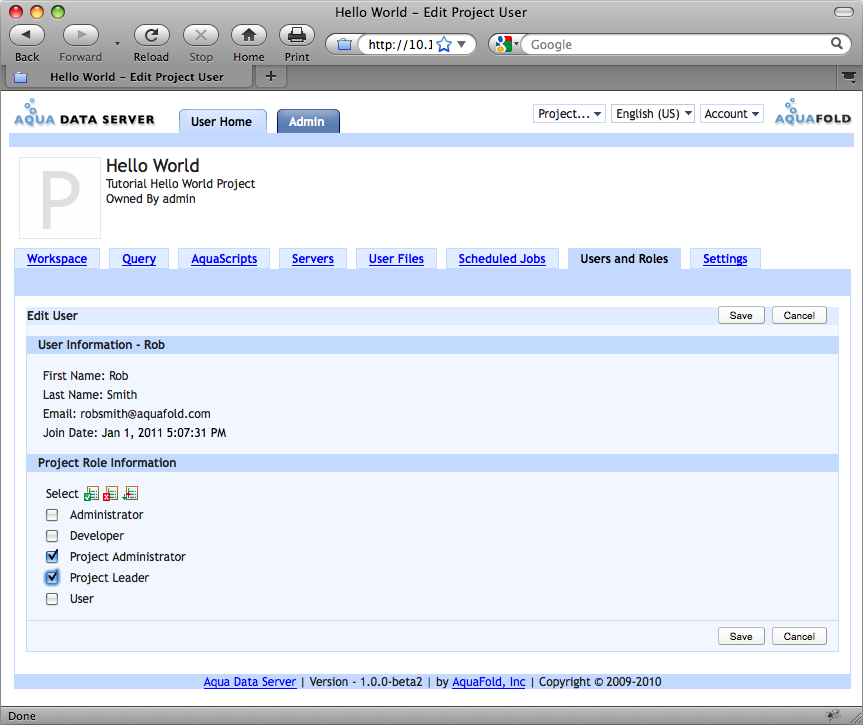 The Edit User action enables you to change the set of roles assigned to a user for the current project. All roles existing in the current project are listed and multiple roles can be assigned to the user. If multiple roles are chosen, Aqua Data Server aggregates the set of granted permissions across the chosen roles for that user and applies this aggregated set of permissions when determining whether the user has access to a specific action on a given object. For example, lets say we have created 2 roles, Project Leader and Project Administrator in Project HelloWorld. The Project User role only has the View Workspace, Execute AquaScript and Execute any AquaScript permissions enabled. The Project Administrator has only the "Manage Users & Role" permission enabled. We grant user Rob access to both the Project Leader and Project Administrator roles in Project HelloWorld. Aqua Data Server stores Rob's set of granted permissions for project HellowWorld as: View Workspace, Execute AquaScript, Execute Any AquaScript and "Manage Users & Roles".