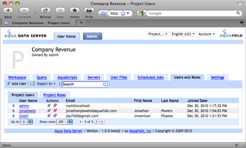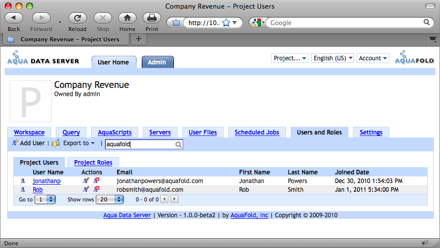 As the usage of Aqua Data Server increases and more and more users are created, you might want to quickly locate a specific user. The search textbox is designed to address this. After typing in your search text in the Action Bar and pressing enter, Aqua Data Server performs a case insensitive, OR search across the user name, email address, first name and last name fields and returns all matching records. For example, lets say you were searching for the text "hon". Aqua Data Server would perform the following search: user.name like %hon% OR user.first_name like %hon% OR user.last_name like %hon% OR user.email like %hon% ==> this would return names like "Anthony" and "Jonathon".