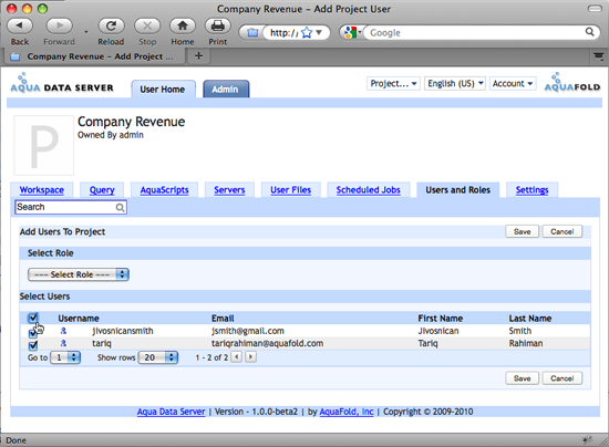 Once you have chosen your users, also specify a role for them using the Select Role dropdown. The role specifies the set of project permissions that the users will be granted. All users will be assigned the same role. Click the Save button to add these users with the specified role. In the next section, we will show you how to change a user's role selection.