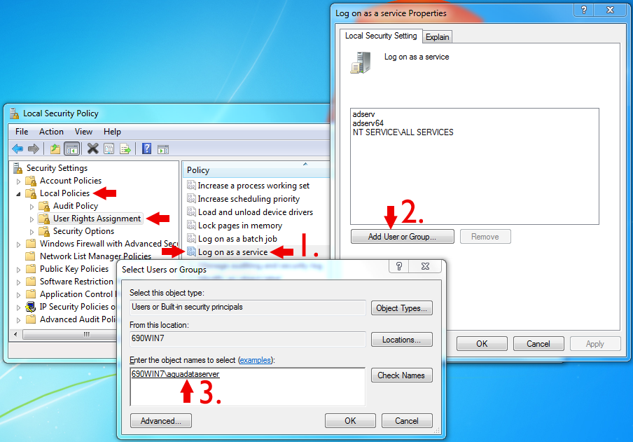 Grant rights to the user to Log on as a service by clicking the Start Menu and typing secpol.msc and pressing enter to launch the Local Security Policy editor.