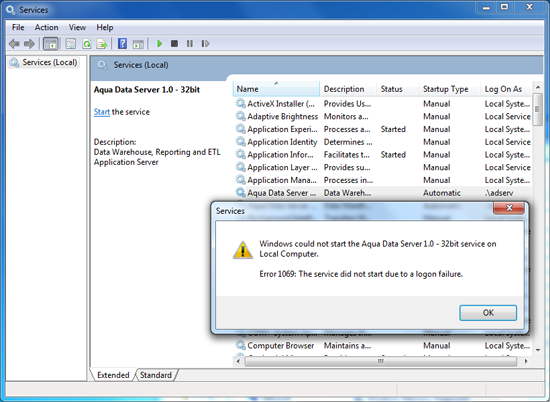 Manually run the Aqua Data Server service by clicking Start->Control Panel->System and Security->Administrative Tools->Services right clicking on the Aqua Data Server service and selecting Start.
