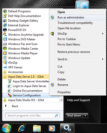 To edit the Memory Max (the amount of memory the JVM will allocate from the OS for use by Aqua Data Server) use the Service Configuration by clicking on Start-> Programs -> Aqua Data Server -> Service Configuration (be sure to right click and 'Run as administrator' if you are in Windows Vista or Windows 7).