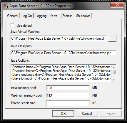Once the Service Configuration window appears, click the Java tab and increase the value in the Maximum Memory Pool field and click OK. The Aqua Data Studio Windows Service must be restarted for this change to take affect.
