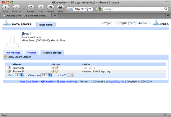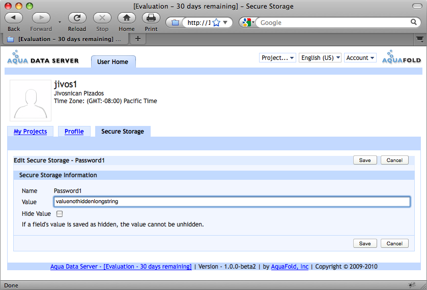 The value of an opaque object can be hidden from displaying in the Aqua Data Server GUI by selecting the “Hide Value” checkbox in the “New Secure Storage” or “Edit Secure Storage” dialog.