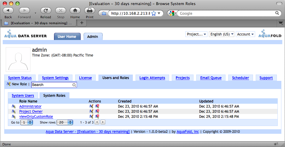 Once you install Aqua Data Server and go to the System Users & Roles tab, you will notice 2 pre-configured System Roles. These are "Administrator" and "Project Owner".