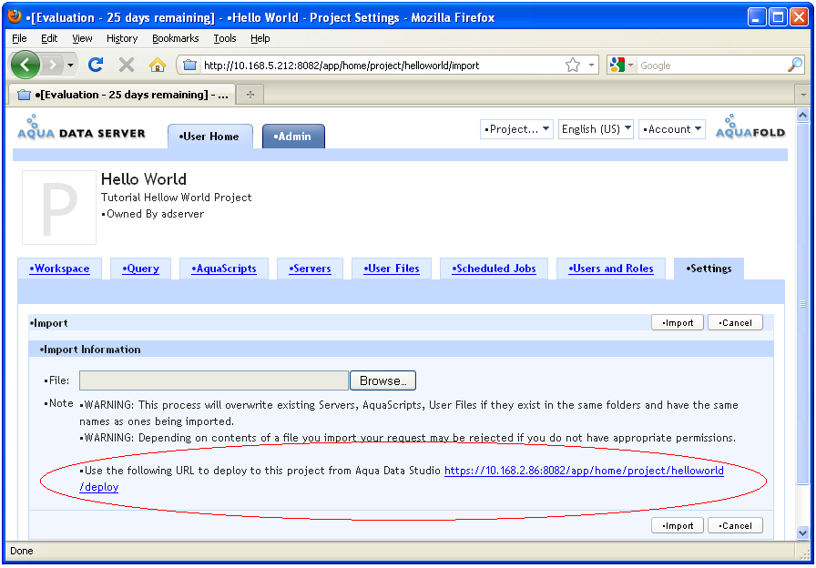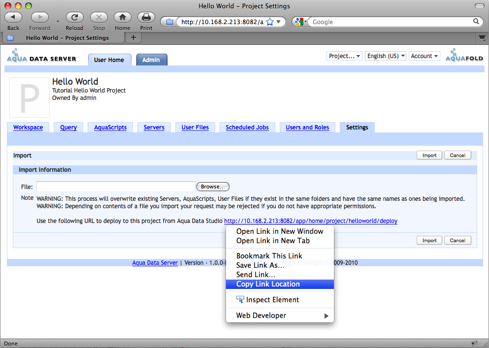 2. On the “Import” page copy the project deploy URL into your clipboard. You will paste this link in Aqua Data Studio.