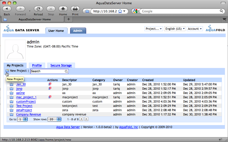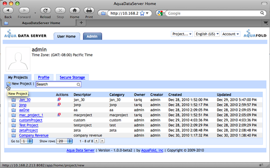 2. In the “My Projects” tab of Aqua Data Server browser window, click on the “New Project” button. If you do not see the "New Project" button, please ask your system administrator to grant you the "Create Project" system permission.