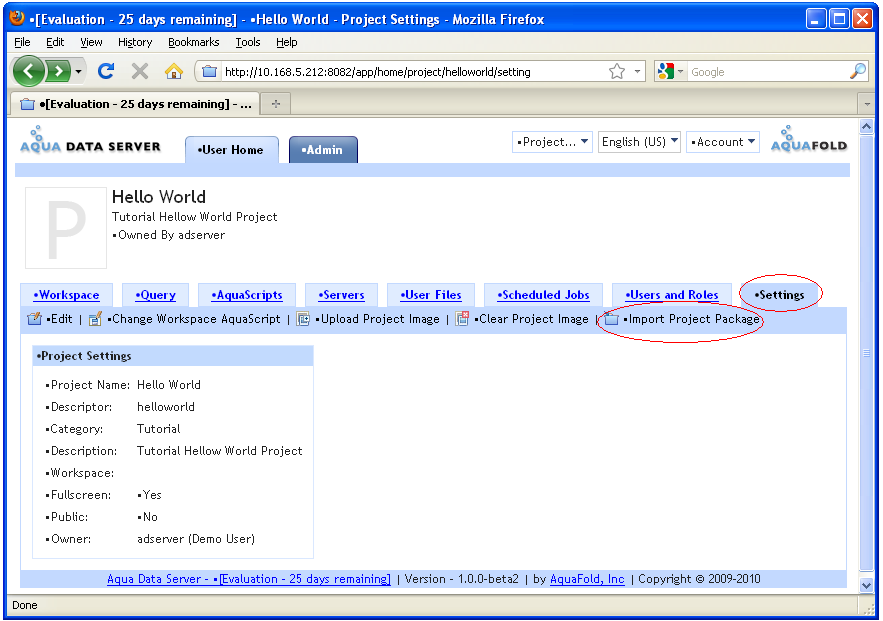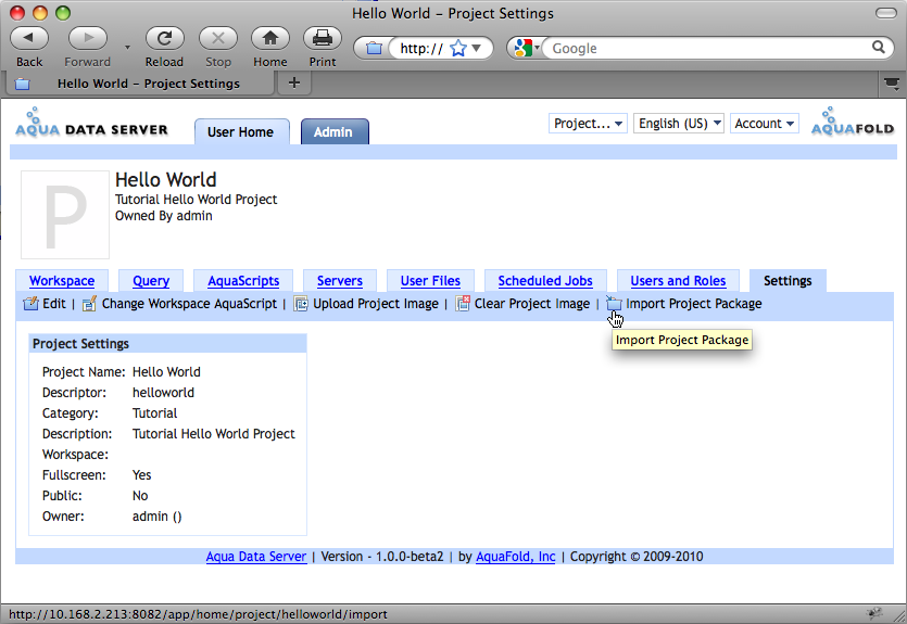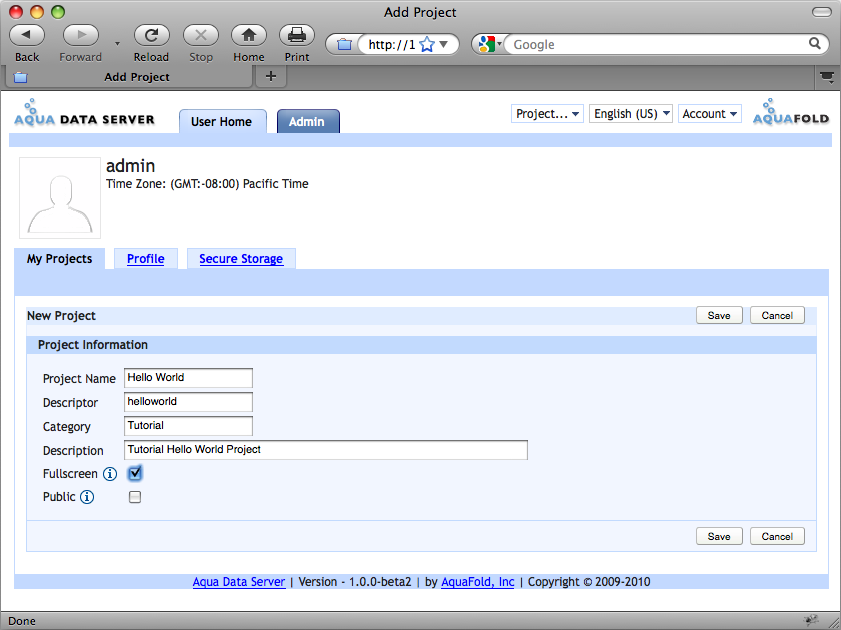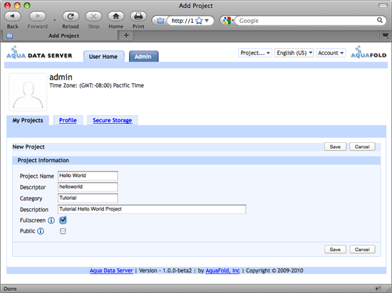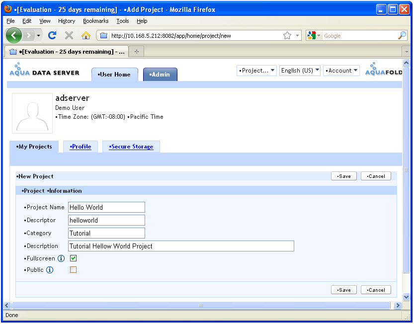 1. Log in to your Aqua Data Server account and create a new project. You will import files into this project from the “HelloWorld” project created in Aqua Data Studio, in a later step.