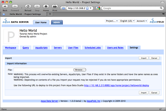 Before you can start deploying projects to Aqua Data Server you need to establish a user account and a project container.