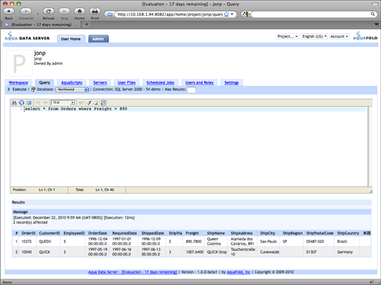 The Action Bar is directly beneath the Application Tabs in the blue stripe, and displays context-sensitive buttons and search forms. In the following screenshot, the view is of the "Jonp" project's Query tab. Notice that database information displays in the Action Bar. A user can Execute, select a database within the connection using a dropdown, and select the Max Results displayed for the query executed. Clicking the Executebutton in the Action Bar executes the query and displays the results.