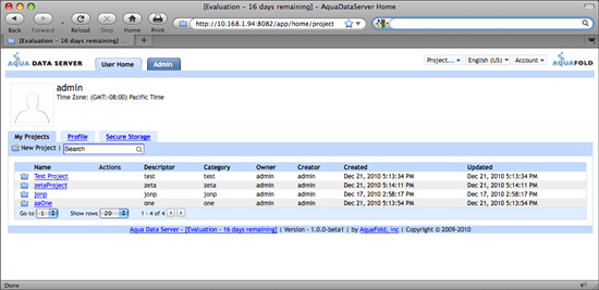 The User Home tab displays three tabs: the My Projects tab, the Profile tab and the Secure Storage tab. In the screenshot below, a user without System Administrator capabilities is viewing the User Home tab. No Admin tab is visible for this user.