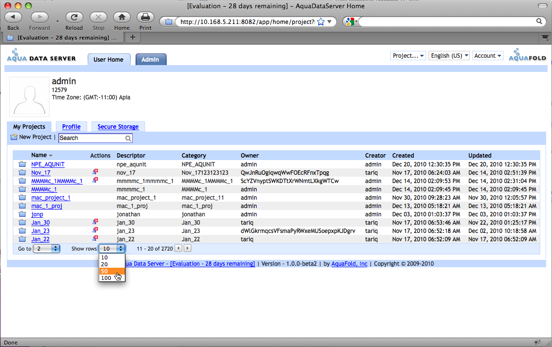 When large lists are generated Aqua Data Server paginates the results and displays a Pagination Navigator at the bottom of the list. Using the Pagination Navigator, it is possible to go to a page of results, select how many rows appear per page, or click forward and back through the pages. In the screenshot below, we are viewing page 2 of a list of Projects. We currently show 10 rows per page. The cursor is selecting from the dropdown to swap from showing 10 rows per page to showing 50 rows per page.