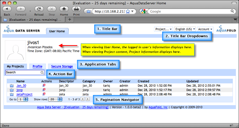 Aqua Data Server's GUI is divided into the following areas.
