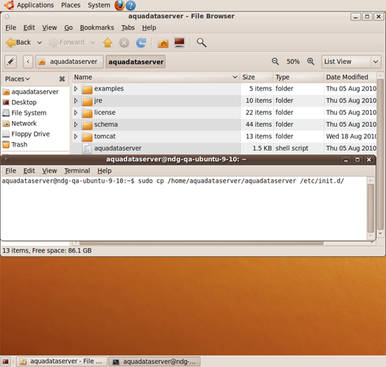 To make sure Aqua Data Server automatically starts every time the operating system is rebooted, copy the aquadataserver bash file to /etc/init.d/