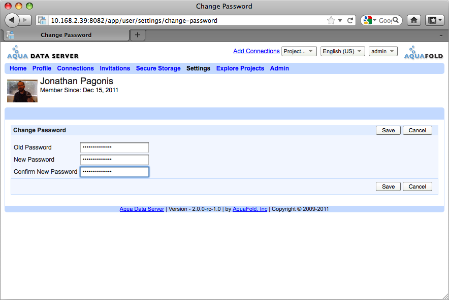 It is recommended that the default Admin password be changed after installation. The Admin password can be changed by clicking the User Home tab at the very top of the page, then clicking the Profile tab in the lower tabs. On the resulting Profile page click the Change Password button below the Profile tab.