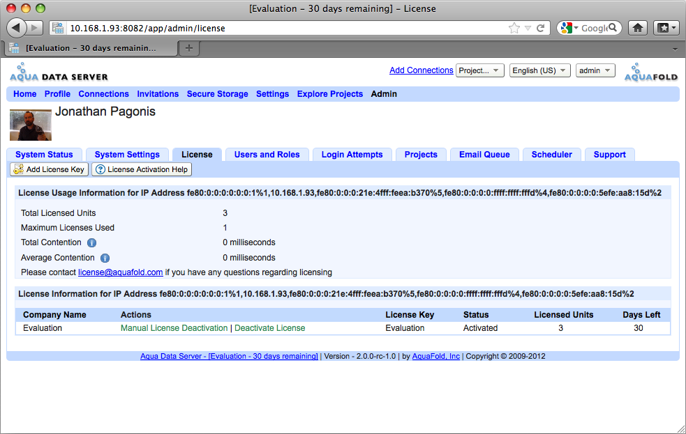Clicking Add Evaluation License Key underneath the Activation tab adds an Evaluation License of 3 units. The Evaluation License MUST be activated for it to be used. Click the Activate License icon to begin the Evaluation. The number of days left on the Evaluation will be listed to the right after the Evaluation has been Activated and the title bar of your web browser will inform you of the number of days remaining in the evaluation even when you are not on the Activation page.